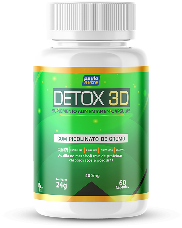 Detox 3D é uma fórmula desenvolvida nos Estados Unidos, que ganhou repercussão em programas de TV de emagrecimento.Tem como principais compostos o Picolinato Cromo, vitamina A, vitamina B1 (Tiamina), vitamina B3 (Niacina), vitamina B5 (Acido Pantotênico), vitamina B6 (Pirodoxina), vitamina B12 (Cianocobalamina), Vitamina C (Acido Ascorbico), vitamina D3 (Colicalciferol), vitamina E (Fitomenadional), Ácido fólico, Biotina, Cálcio, Cobre, Ferro, Fluor, Iodo, Manganes, Molibdênio, Selênio e Zinco formando juntos um excelente time para o emagrecimento rápido e saudável.